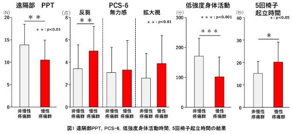 椎体骨折受傷後に慢性疼痛を発生する患者の入院2週後における特徴として,①患部の遠隔部における圧痛閾値(pressure pain threshold; PPT)が低下している.②痛みの反芻が強い,③5回椅子起立時間が遷延している,④低強度の身体活動時間が減少していること,の4つが認められました.さらにこれらのかなでも,5回椅子起立時間の遷延と低強度の身体活動時間の減少が慢性疼痛の発生に影響することが明らかになりました.