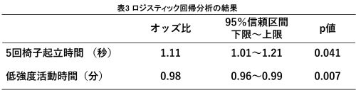 群間比較の結果,患部の遠隔部のPPTおよび低強度の身体活動時間について,慢性疼痛群は非慢性疼痛群と比べて有意に低値でした.また,PCS-6の反芻および5回椅子起立時間について,慢性疼痛群は非慢性疼痛群と比べて有意に高値でした(図1).ロジスティック回帰分析の結果,5回椅子起立時間と低強度の身体活動時間が慢性疼痛の発生に影響する因子として抽出されました(表3).